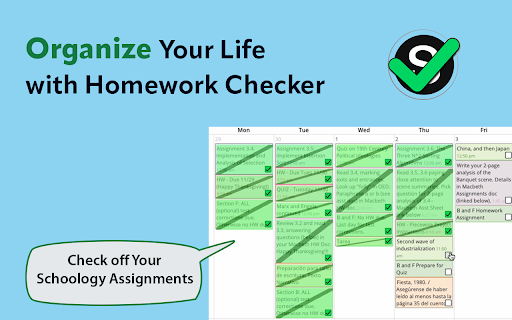 Organize your school life and motivate yourself with Homework Checker. Keep track of your complete/incomplete Schoology assignments by checking them off. Learn more at joelgrayson.com/software/homework-checker or see the open-source code at github.com/JoelGrayson/Homework-Checker