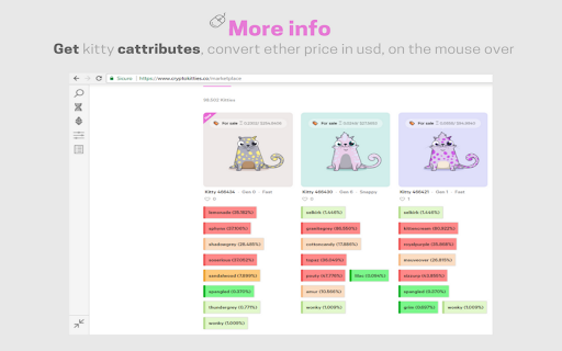 Increase productivity with this tools. Find kitties, compare, get genealogy and more actions with a fancy sidebar for Cryptokitties game.