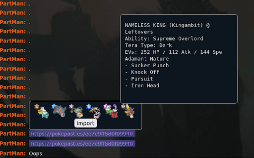 "description": "A Chrome extension for Pok\u00e9mon Showdown that offers a seamless Pok\u00e9paste experience.",