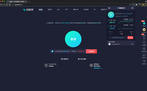 网速管家Speedtest是由https://www.speedtest.cn開發的Chrome擴展程式,該擴展的主要功能是“在工具栏中测试Wi-Fi和宽带网速,以及检测当前浏览网页打开速度”。